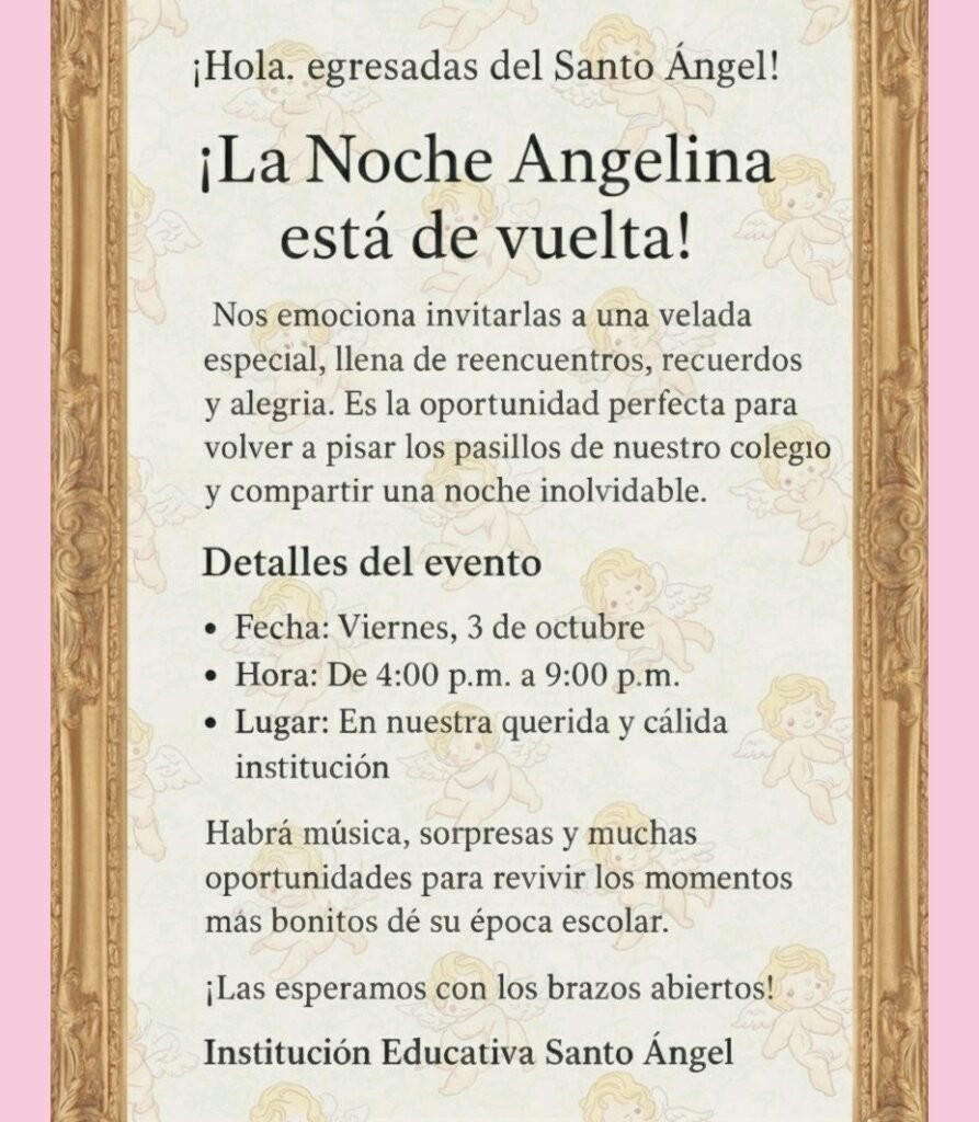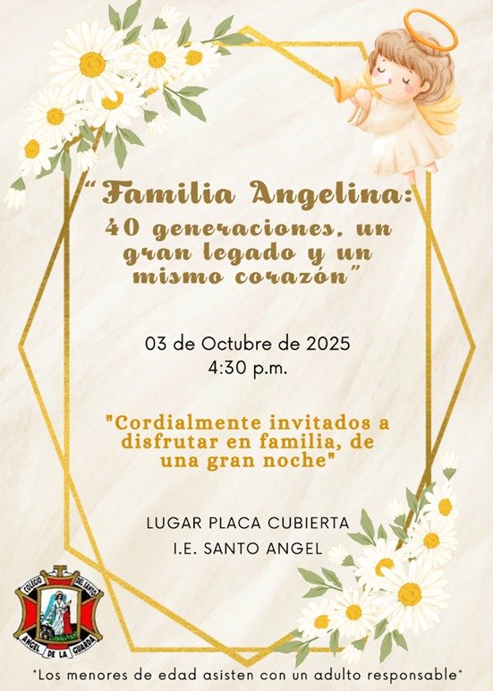 Estimada Comunidad, queremos invitarlos a la Noche de La Familia Angelina, evento que busca unir nuestras voces de alumnos, egresadas, acudientes, docentes en ejercicio y en retiro, Asopadres, personal administrativo, etc., en un único sentir el día 27 de septiembre a las 4:00 PM. ¡Los esperamos!