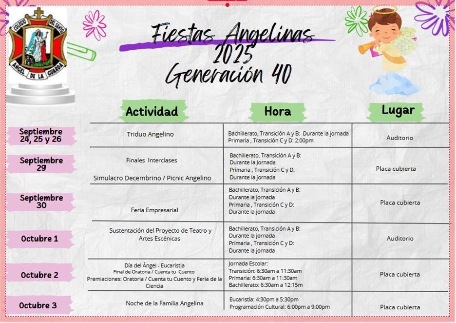 Estimada Comunidad Angelina, compartimos con gran alegría e ilusión el cronograma que se desarrollará durante las Fiestas Angelinas 2025 G-40.
